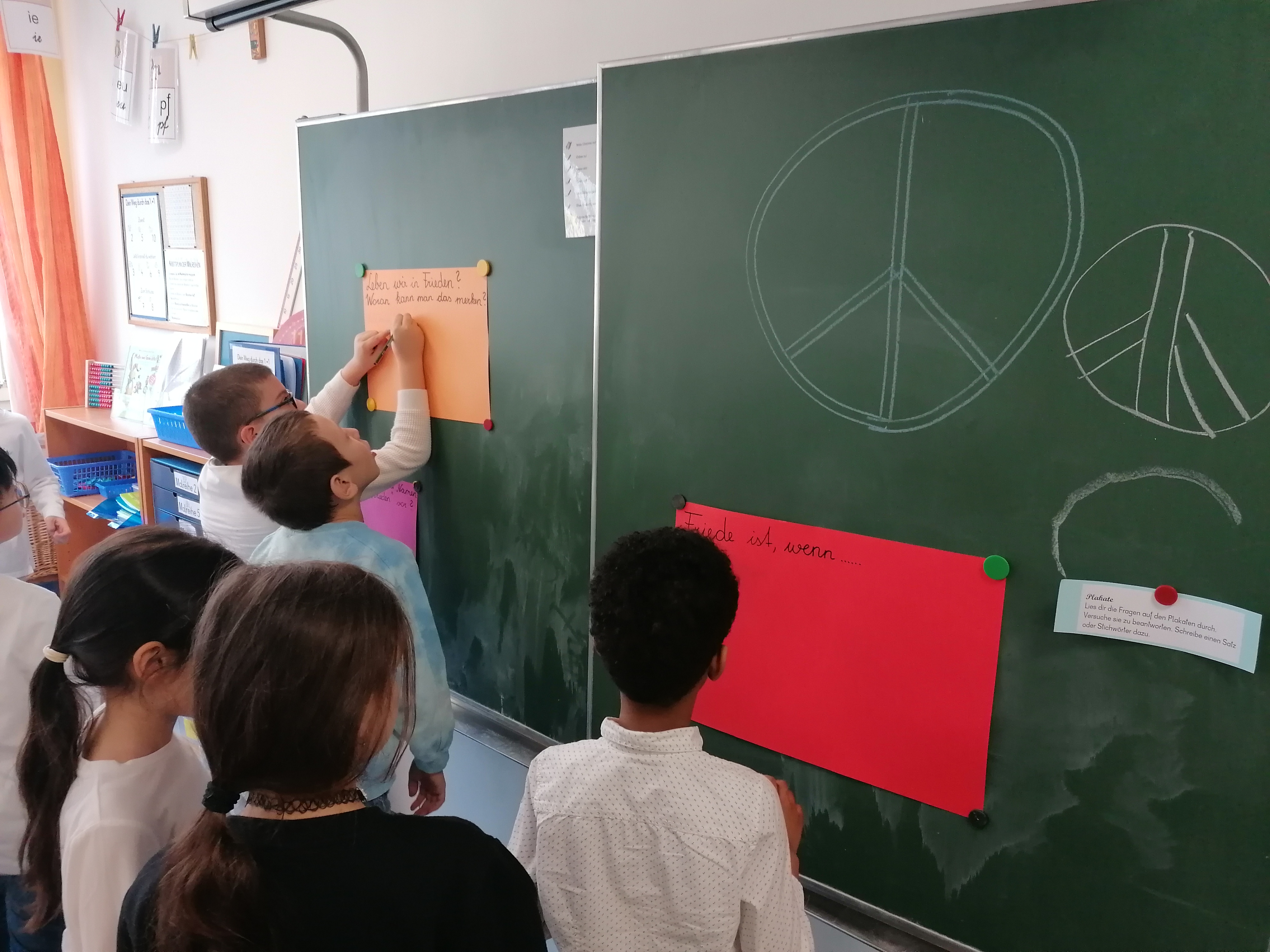 Wo fängt Frieden an? Was ist für dich Frieden? Finden wir Frieden auch im Schulhaus? Wie können wir friedlich miteinander sein?