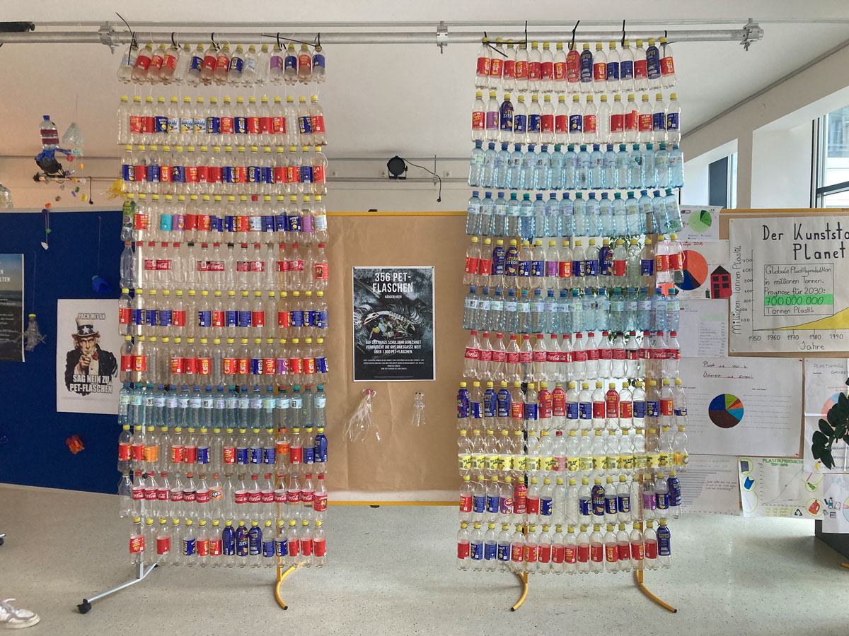 Das Ökoparlament hatte in diesem Schuljahr unter anderem das Ziel, ein Zeichen gegen die Plastikflut zu setzen. Vor allem wollten die Schüler*innen etwas gegen die Vielzahl an PET-Flaschen unternehmen, die in der AHS in einem Schuljahr konsumiert werden. Deshalb wurden von März bis Mai die benutzten PET-Flaschen gesammelt, die nun in Form zweier „Skultpuren“ im Rahmen einer Ausstellung in der Aula präsentiert werden. Die große Menge an Flaschen, die den Schüler*innen dadurch vor Augen geführt wird, soll dazu animieren, Einweg PET-Flaschen in Zukunft zu vermeiden.
