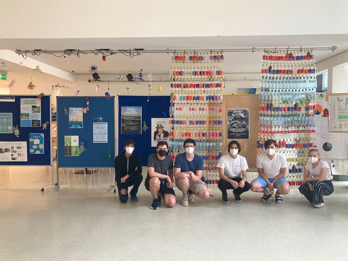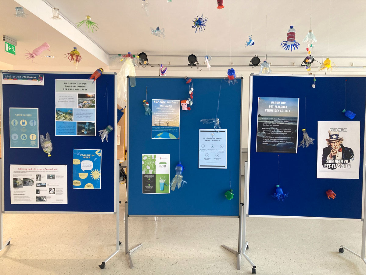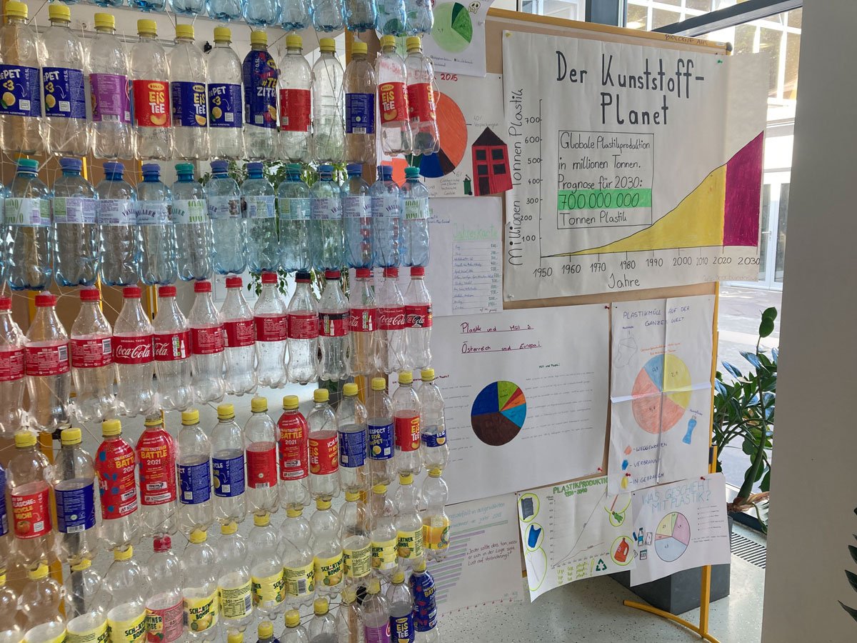 Präsentiert werden zudem sowohl informative Plakate über die Umweltauswirkungen von Kunststoffmüll als auch Diagramme über die weltweite Kunststoffproduktion, die die 4C im Mathematikunterricht erstellt hat. Außerdem gestalteten die Schüler*innen der 1B und der 2C Quallen und andere Meerestiere aus gesammelten PET-Flaschen. Sie sollen auf die Verschmutzung der Meere und auf die negativen Auswirkungen von Kunststoffmüll bzw. Mikroplastik auf Meerestiere aufmerksam machen.