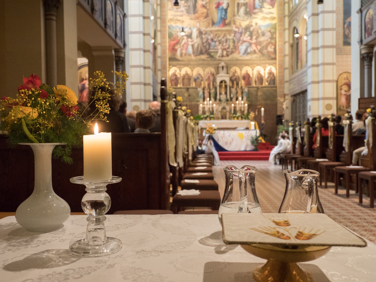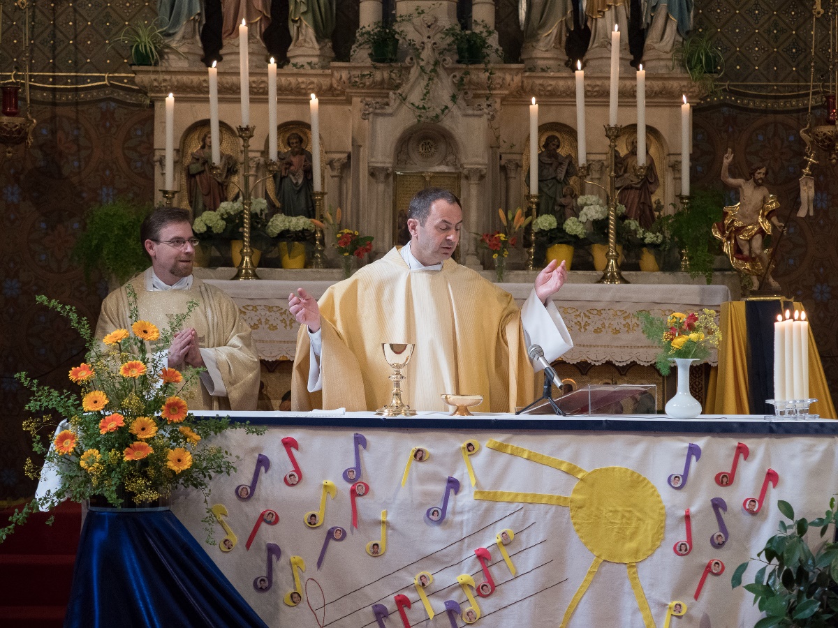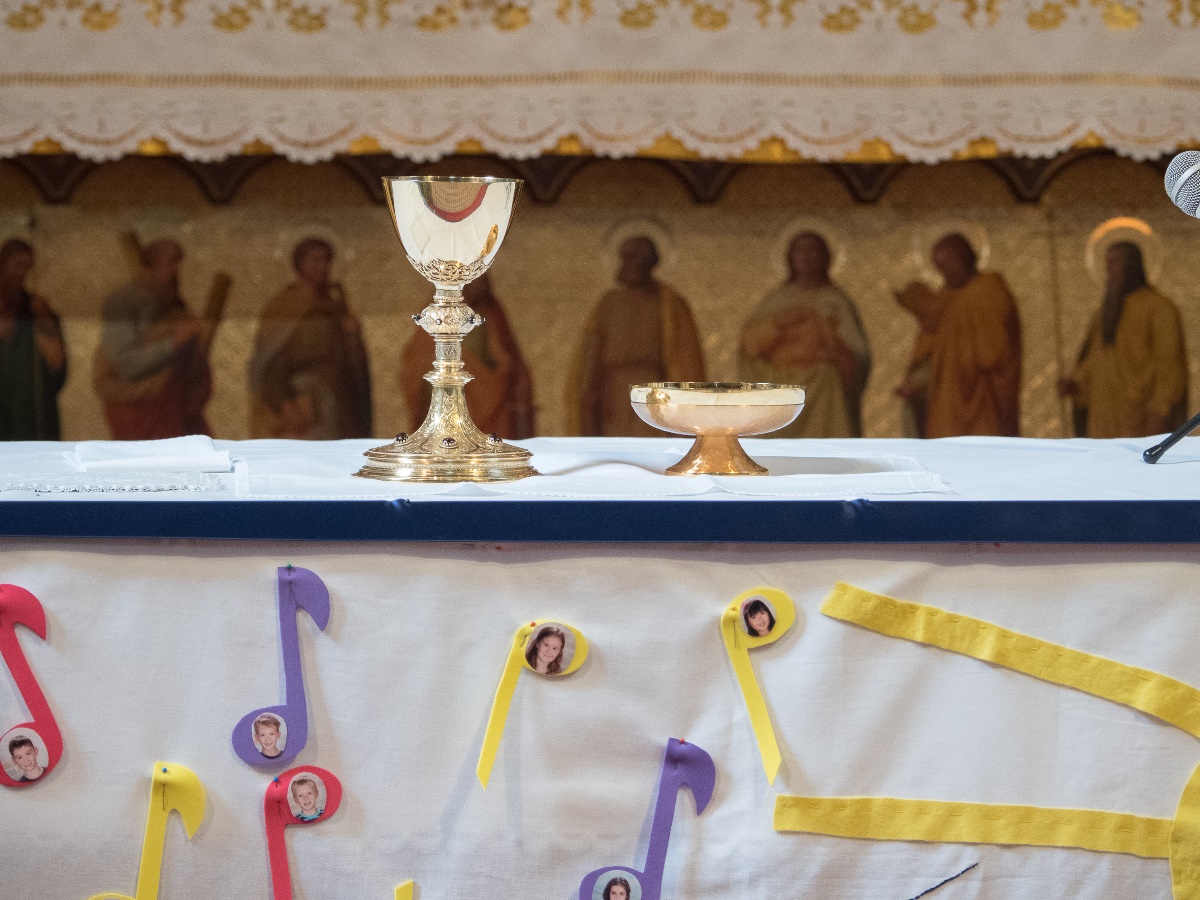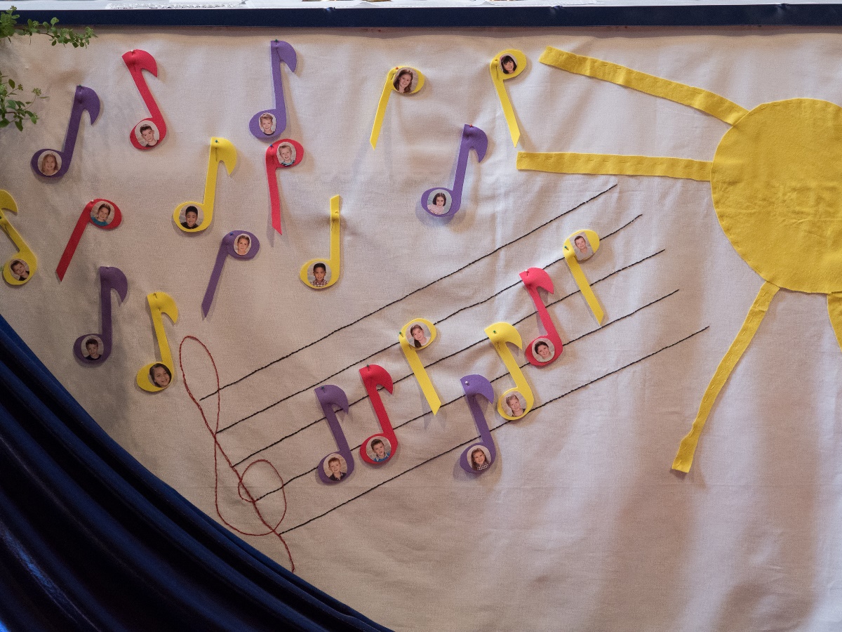 Auf einem wunderschönen Altartuch mit Notenlinien symbolisierten Noten mit den Bildchen aller Erstkommunionkinder die schöne Melodie, die die Gemeinschaft mit Jesus ergibt.