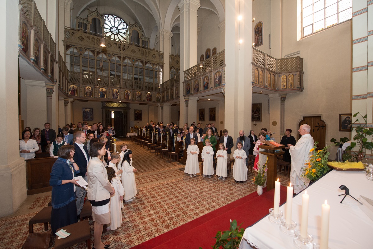 Am 14. April 2018 feierten die Kinder der 2A und 2C mit Pfarrer Martin Rupprecht und die 2B-Klasse mit Pater Josef Süß ihre Erstkommunionsfeste in unserer Schulkirche. Beide Feiern standen unter dem Motto „Wir sind ein Ton in Gottes Melodie.“
