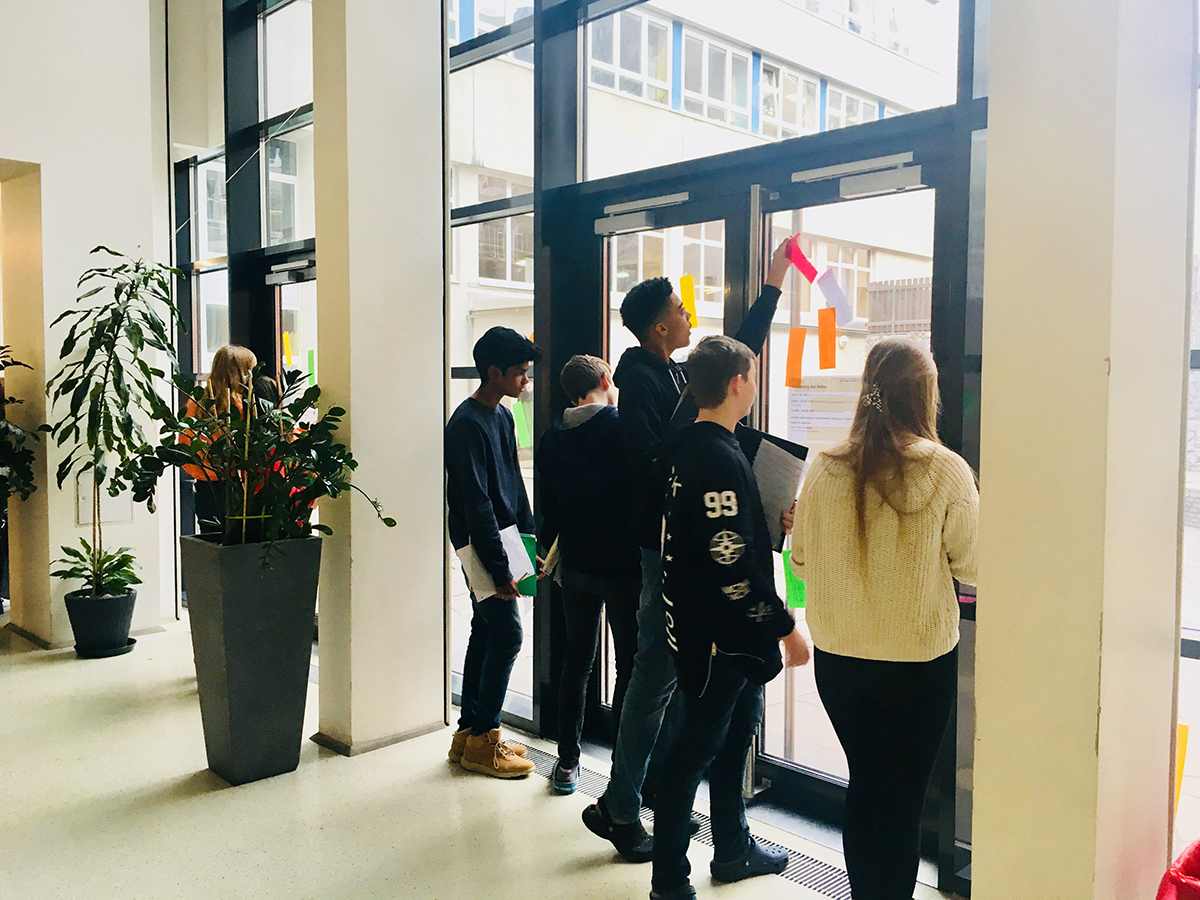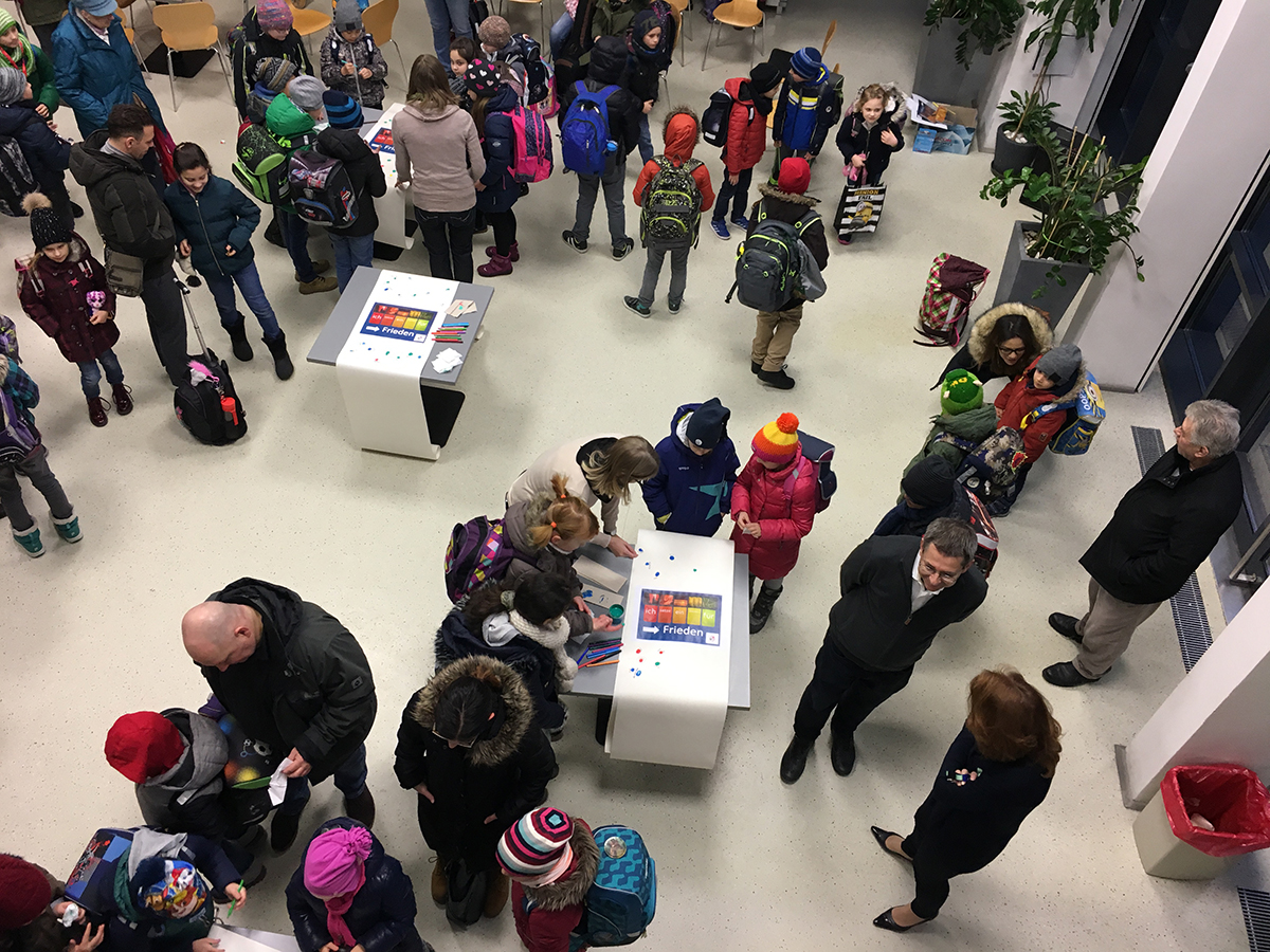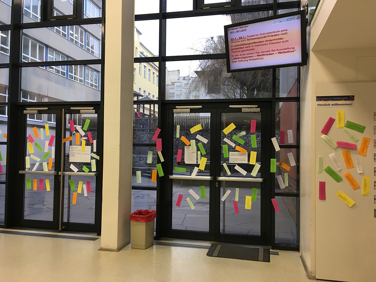 Die Woche begann mit einer Aktion in der Aula: Unter dem Motto „Wir setzen ein Zeichen für den Frieden“ konnten SchülerInnen ihre Unterstützung für das Anliegen mit ihrem Fingerabdruck und ihrer Unterschrift bekunden.