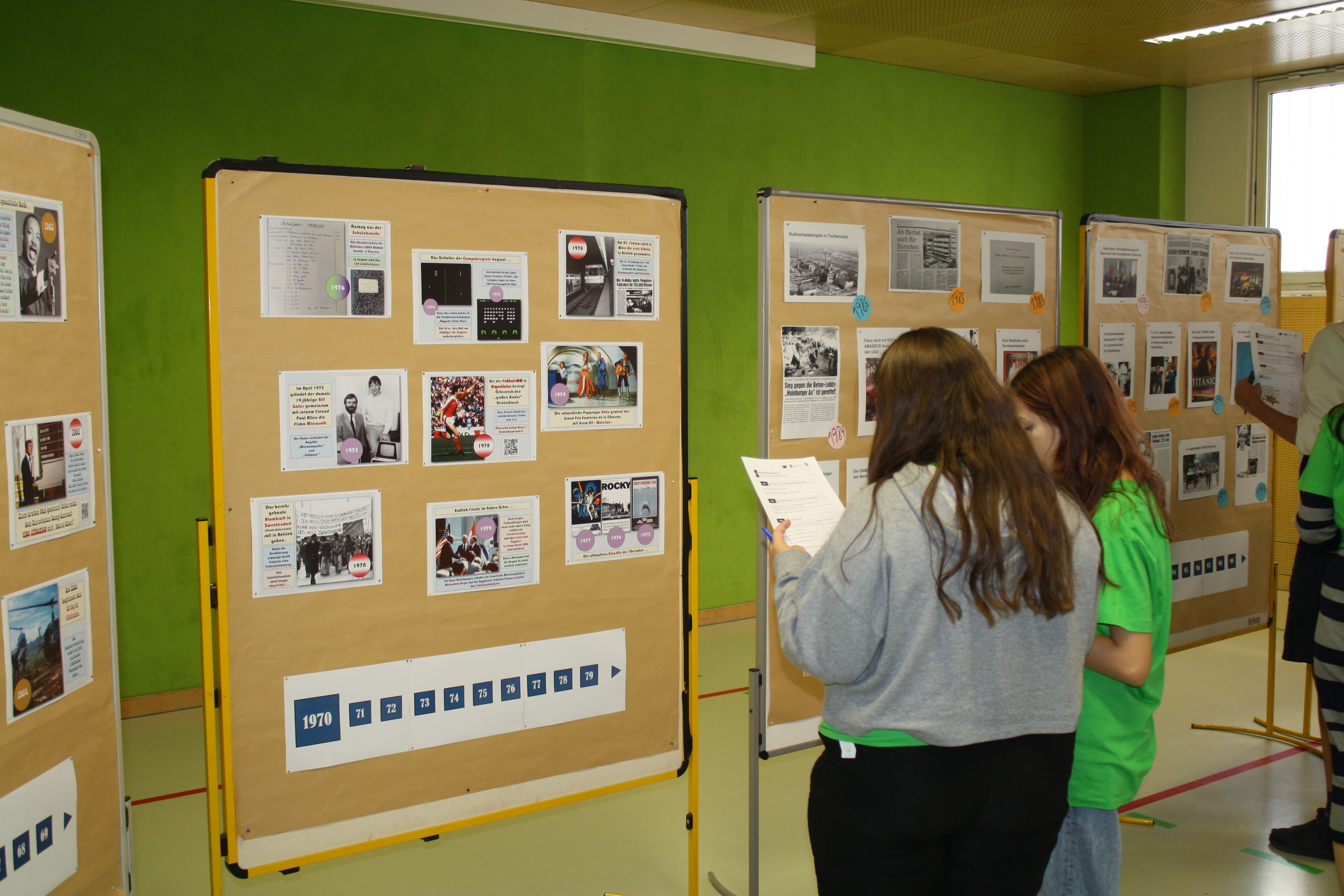 Am 2.10. gingen unsere Schülerinnen und Schüler beim Stationenbetrieb auf Entdeckungsreise durch die (Schul-)Geschichte der vergangenen 60 Jahre. Im Turnsaal, in der Aula und im eigenen Klassenraum galt es, folgende Aufgaben zu lösen: