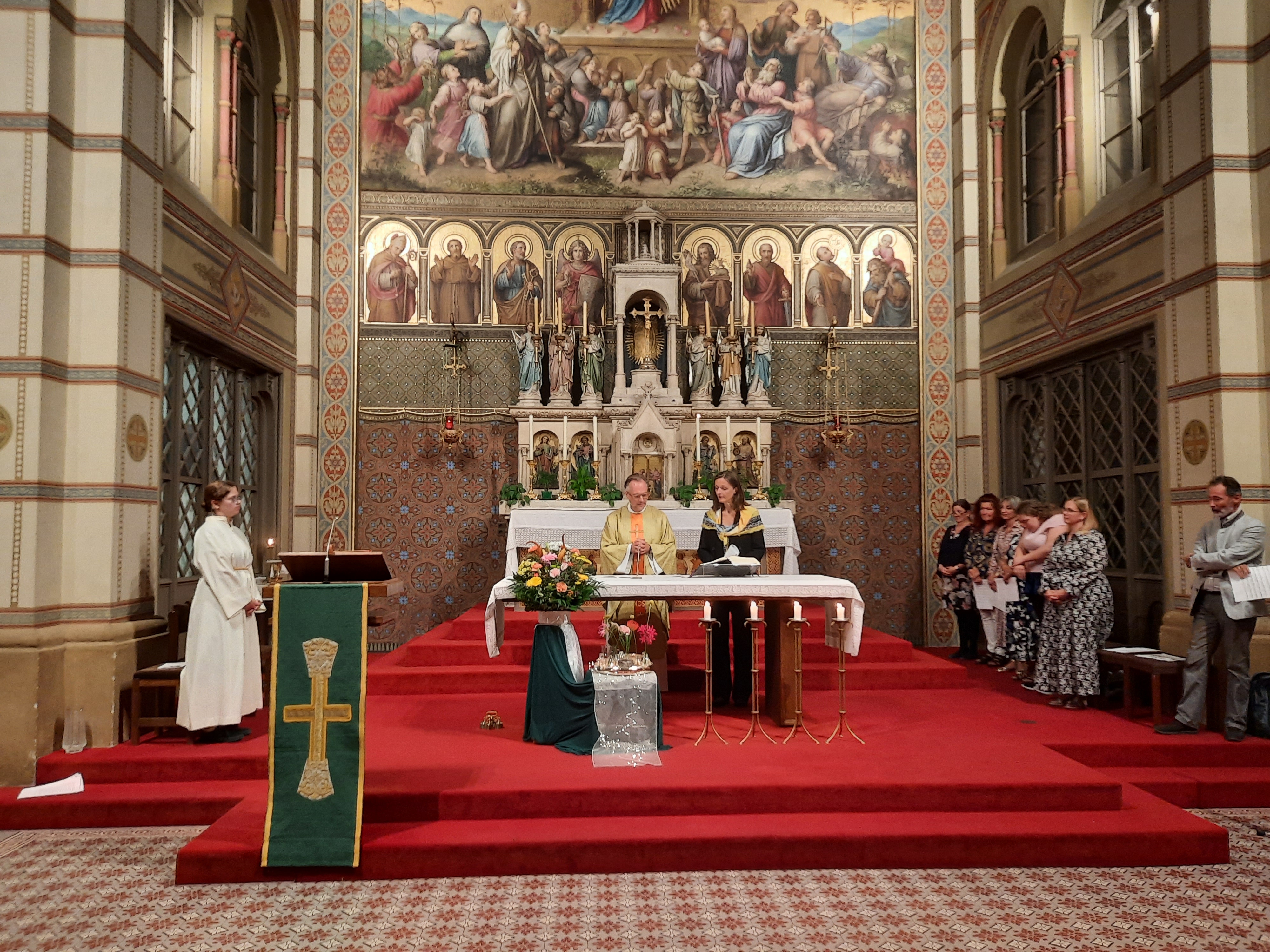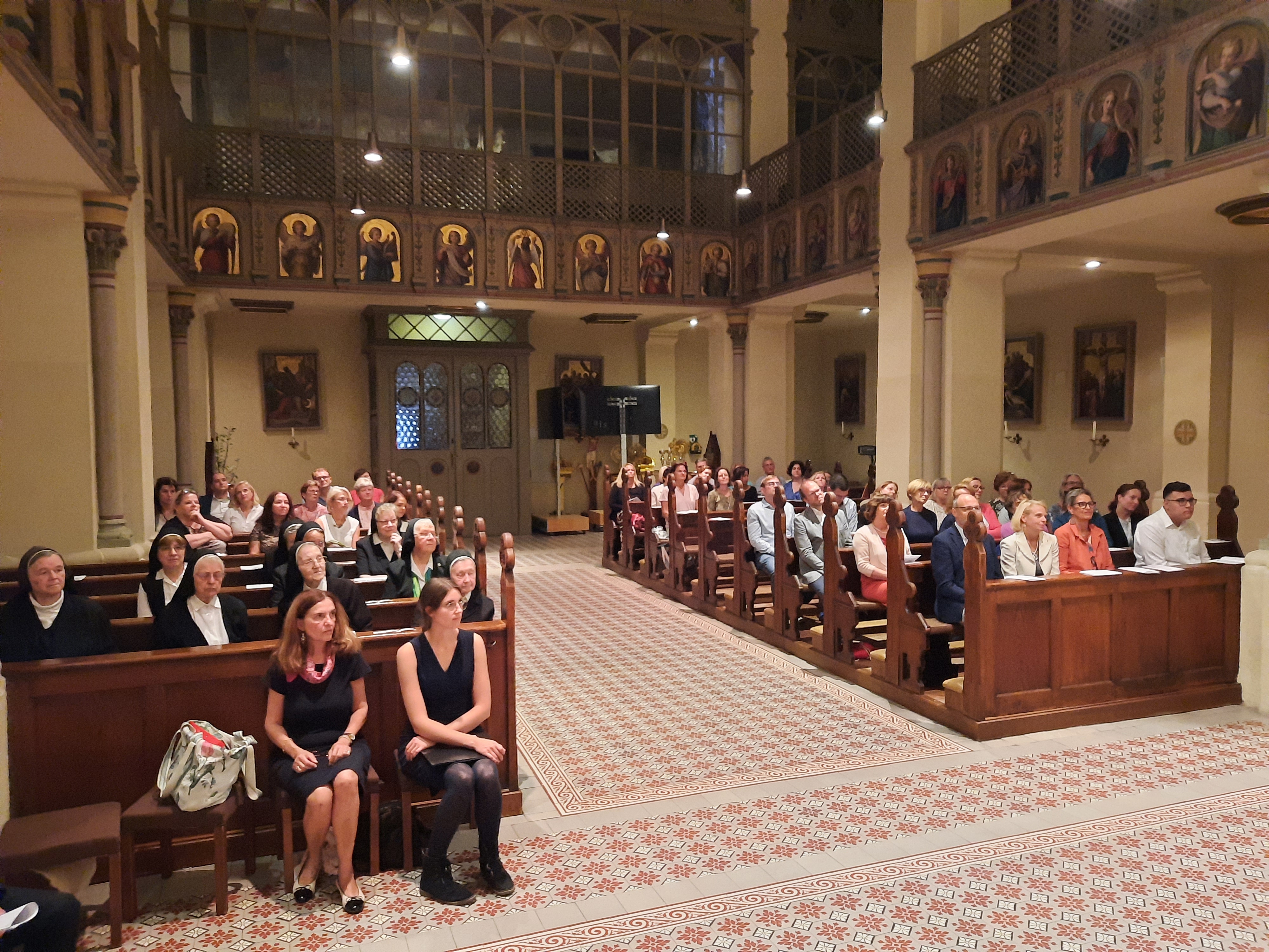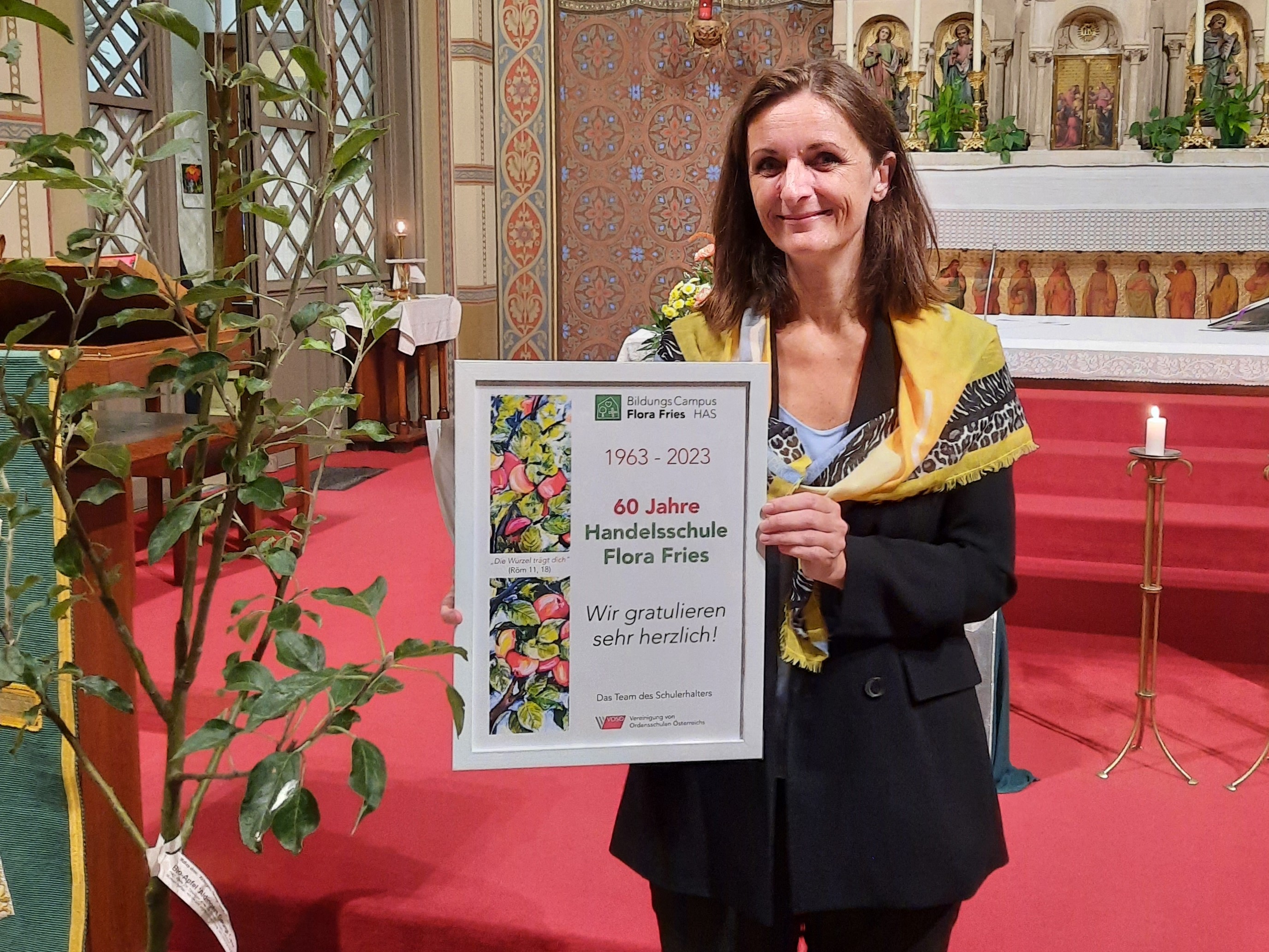 Am 3.10. fand ein Festgottesdienst in der Schulkirche statt, an dem auch zahlreiche Ehrengäste wie Vertreter:innen des Schulerhalters VOSÖ, der Bezirksvorsteher von Rudolfsheim-Fünfhaus und ehemalige Mitarbeiter:innen unserer Handelsschule teilnahmen. Die musikalische Begleitung durch den Lehrer:innenchor verlieh der Veranstaltung einen besonders feierlichen Rahmen. Bei einer anschließenden Agape im Innenhof klang das Jubiläumsfest gemütlich aus.