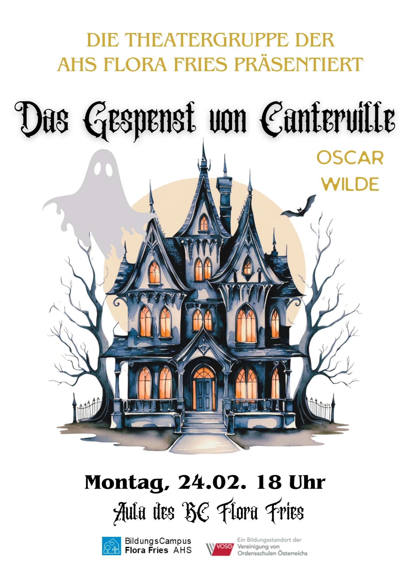 Die Theatergruppe der AHS Flora Fries probt gemeinsam mit Prof. Kogler und Prof. Miele für ihr nächstes Projekt. Die motivierten Schauspieler:innen der 1.-4. Klassen begeben sich auf die schaurigen Spuren des Gespenstes von Canterville, welches der Familie Otis eher Spaß als Spuk bereit. Freuen Sie sich auf eine spannende Theatervorstellung am Montag, 24.02. um 18 Uhr in der Aula des Bildungscampus!