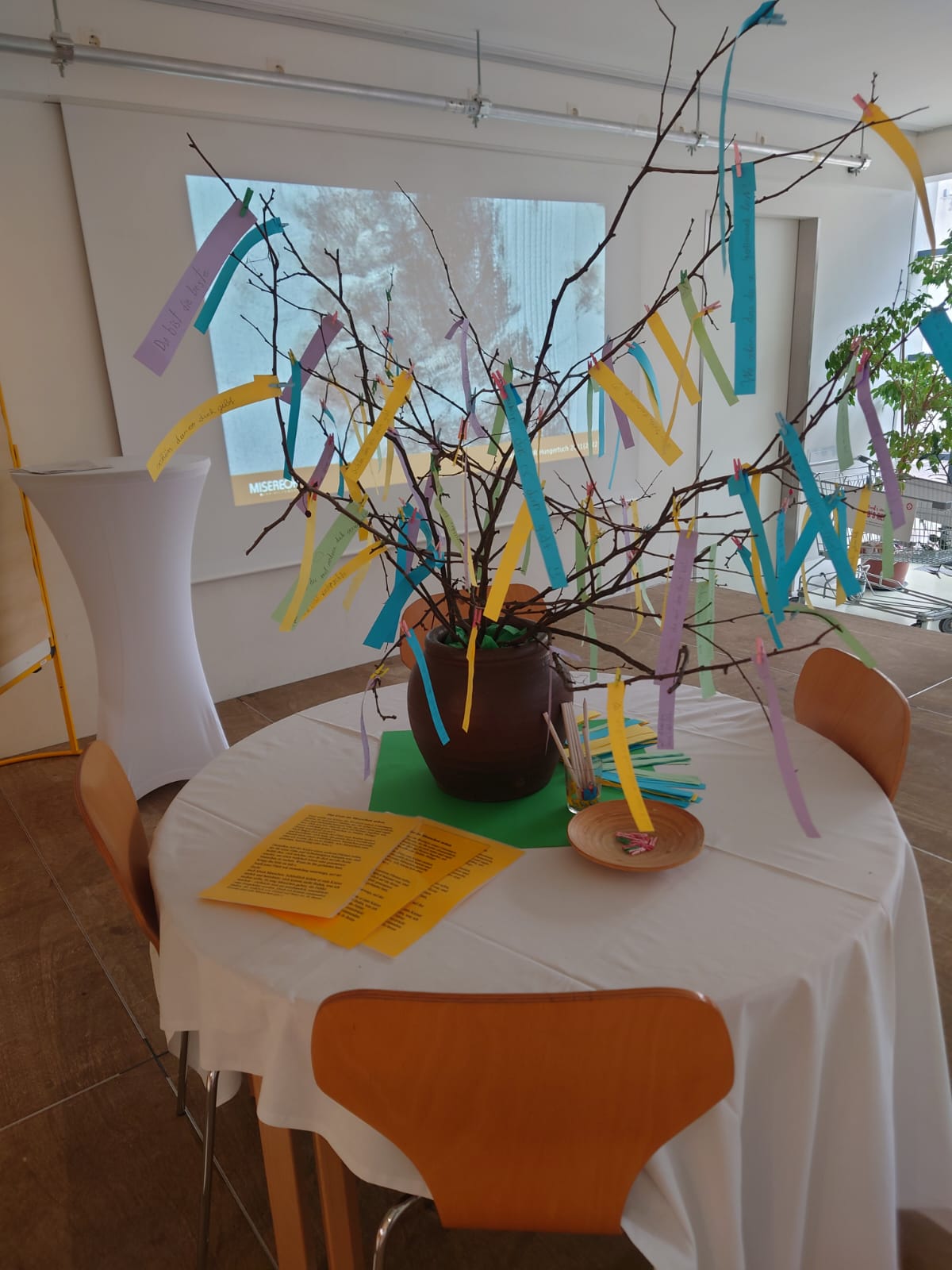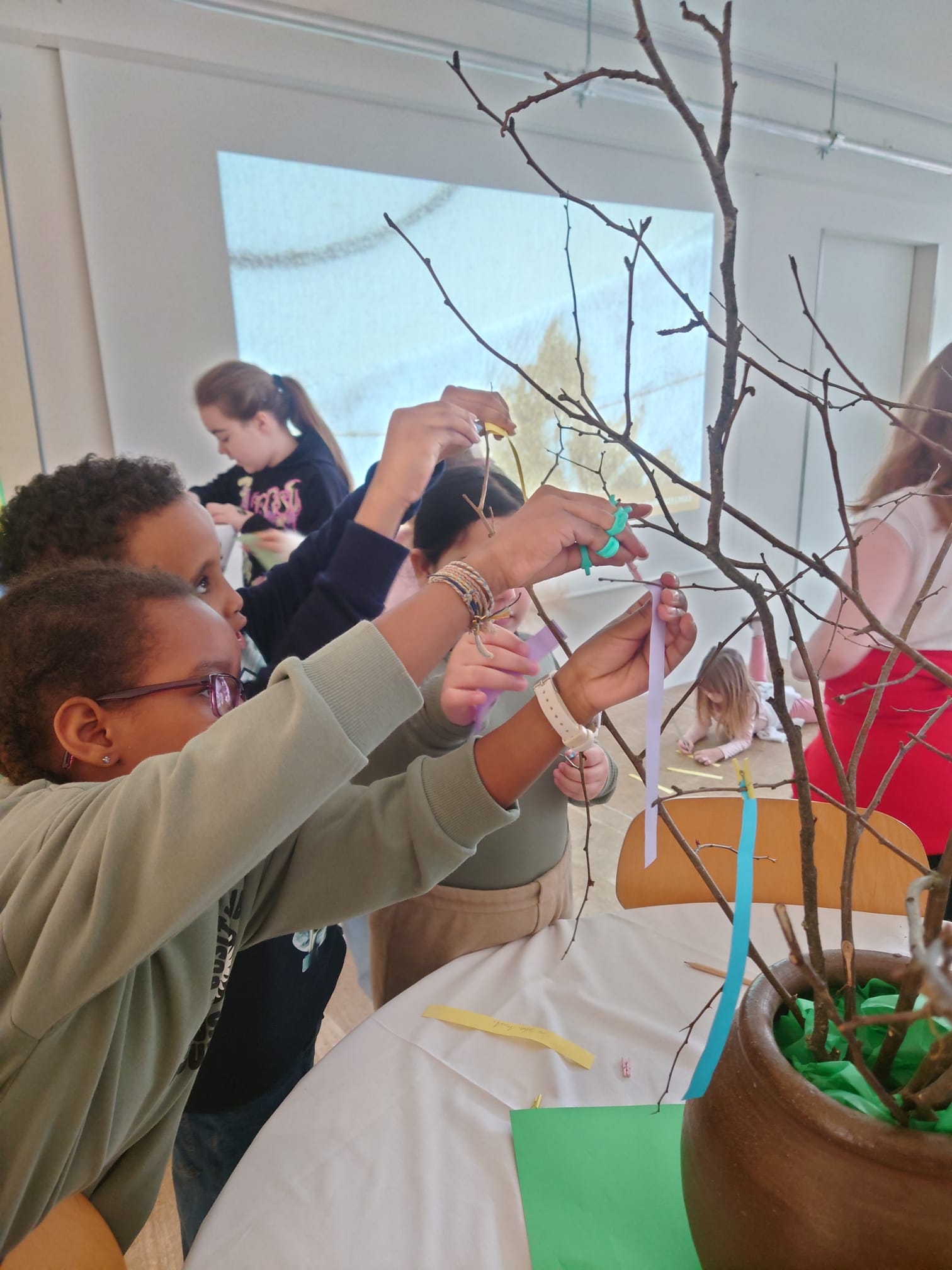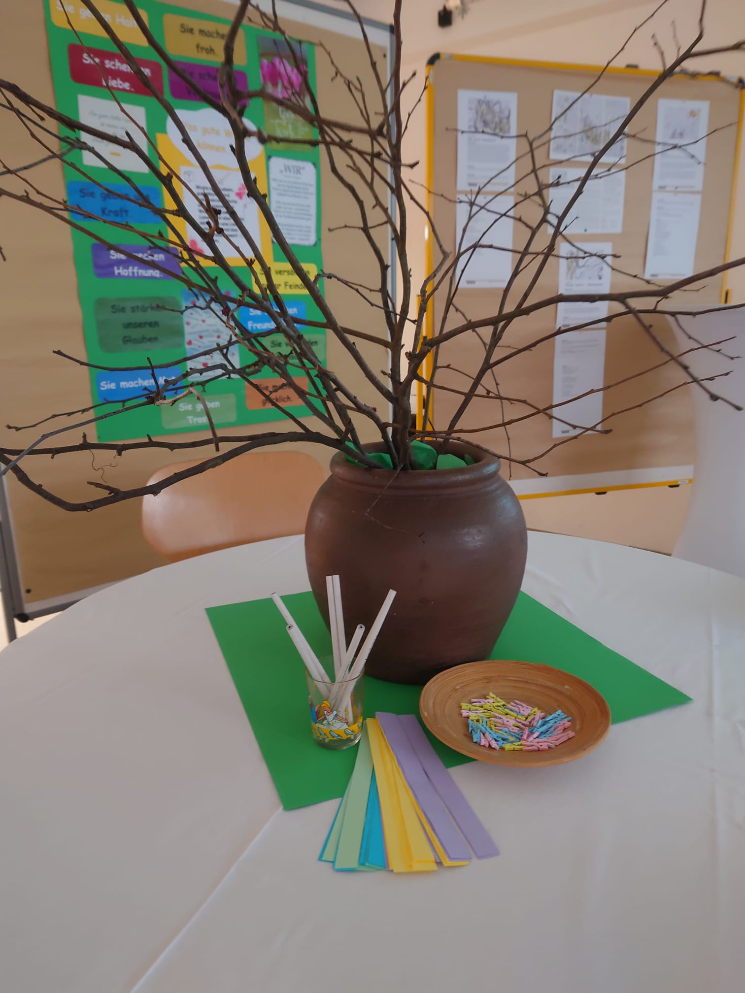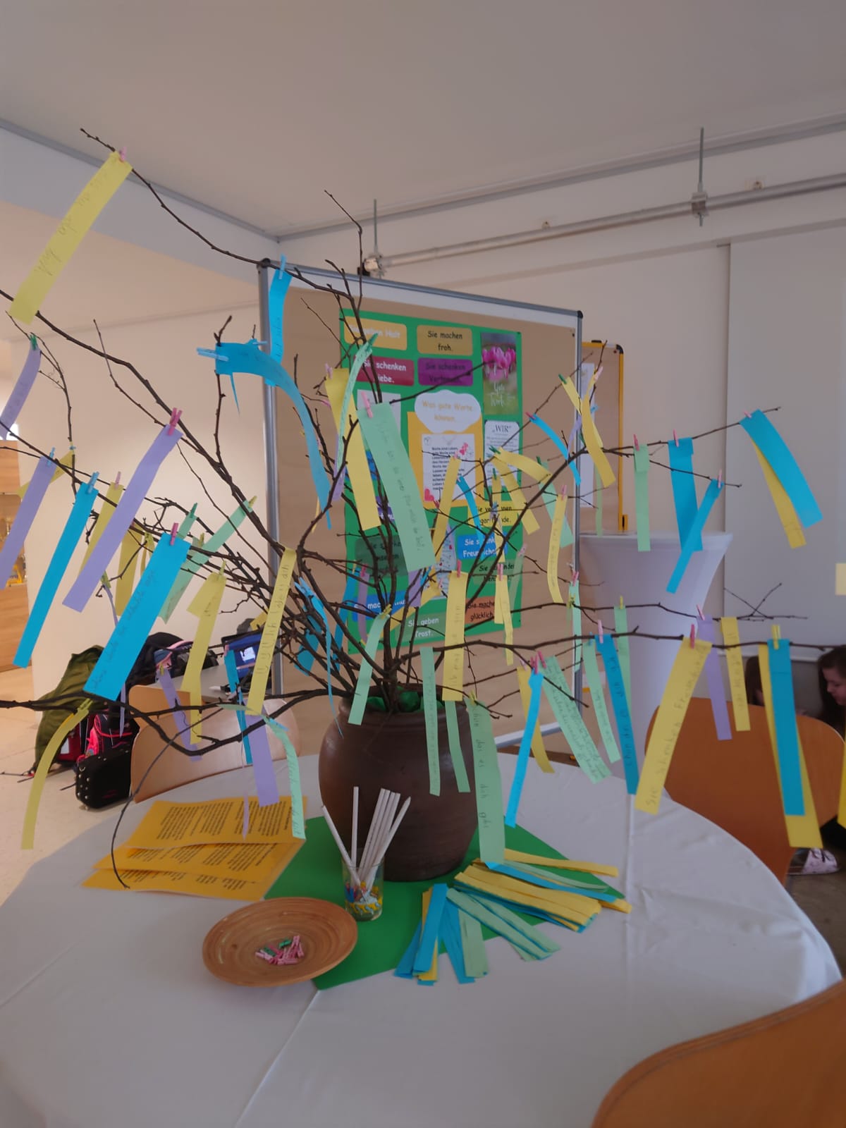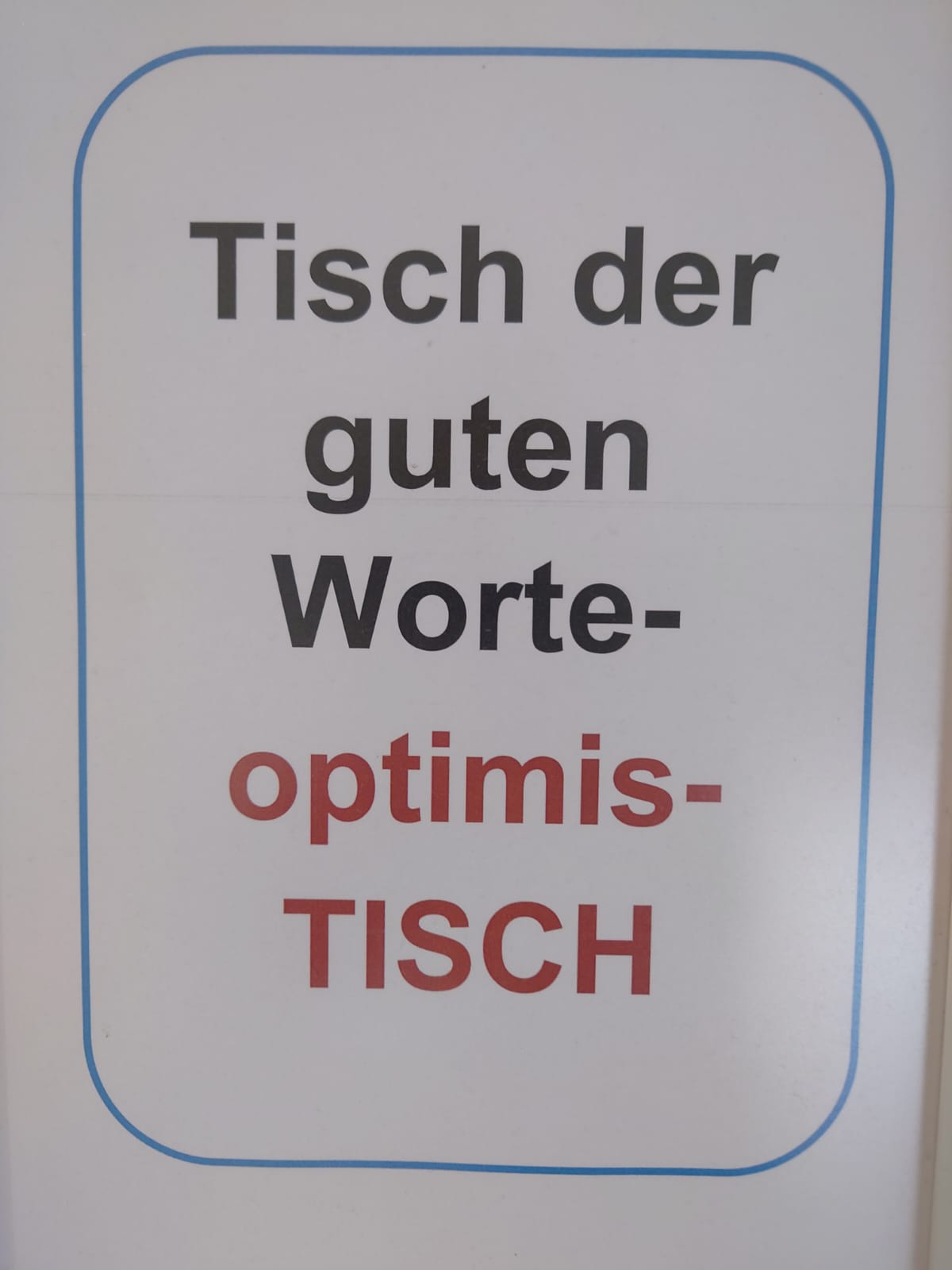 Und gute Worte wollen wir auch in die Welt hinaustragen. Daher steht ein „Baum der guten Worte“ auf unserem Optimis-Tisch in der Aula. Hier haben die Kinder der 3B und 3C viele gute Worte angebracht. Diese sind bereit gepflückt zu werden.