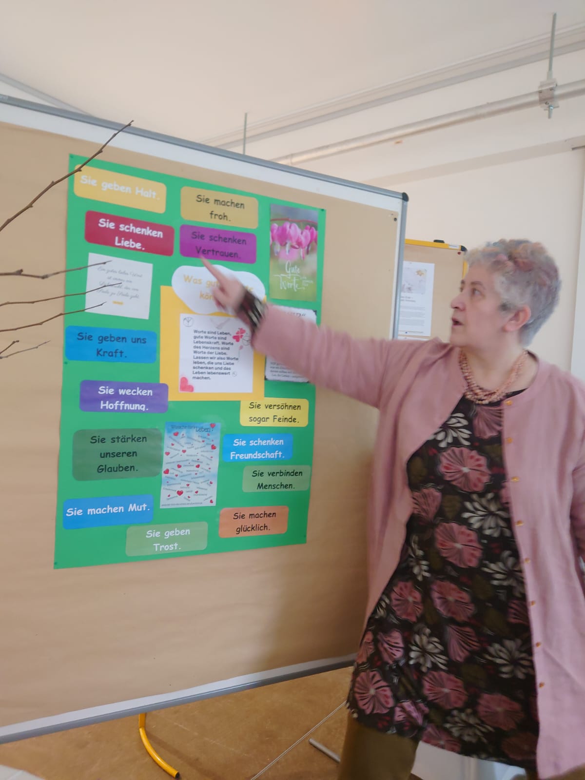 Wir lasen gemeinsam die Geschichte der guten Worte und überlegten, wie gute Worte die Welt verändern können, denn sie können Kraft geben, Trost spenden, Freundschaft und Liebe schenken, sie geben Halt und Sicherheit, sie vermögen so viel. Sie können sogar Feinde versöhnen.