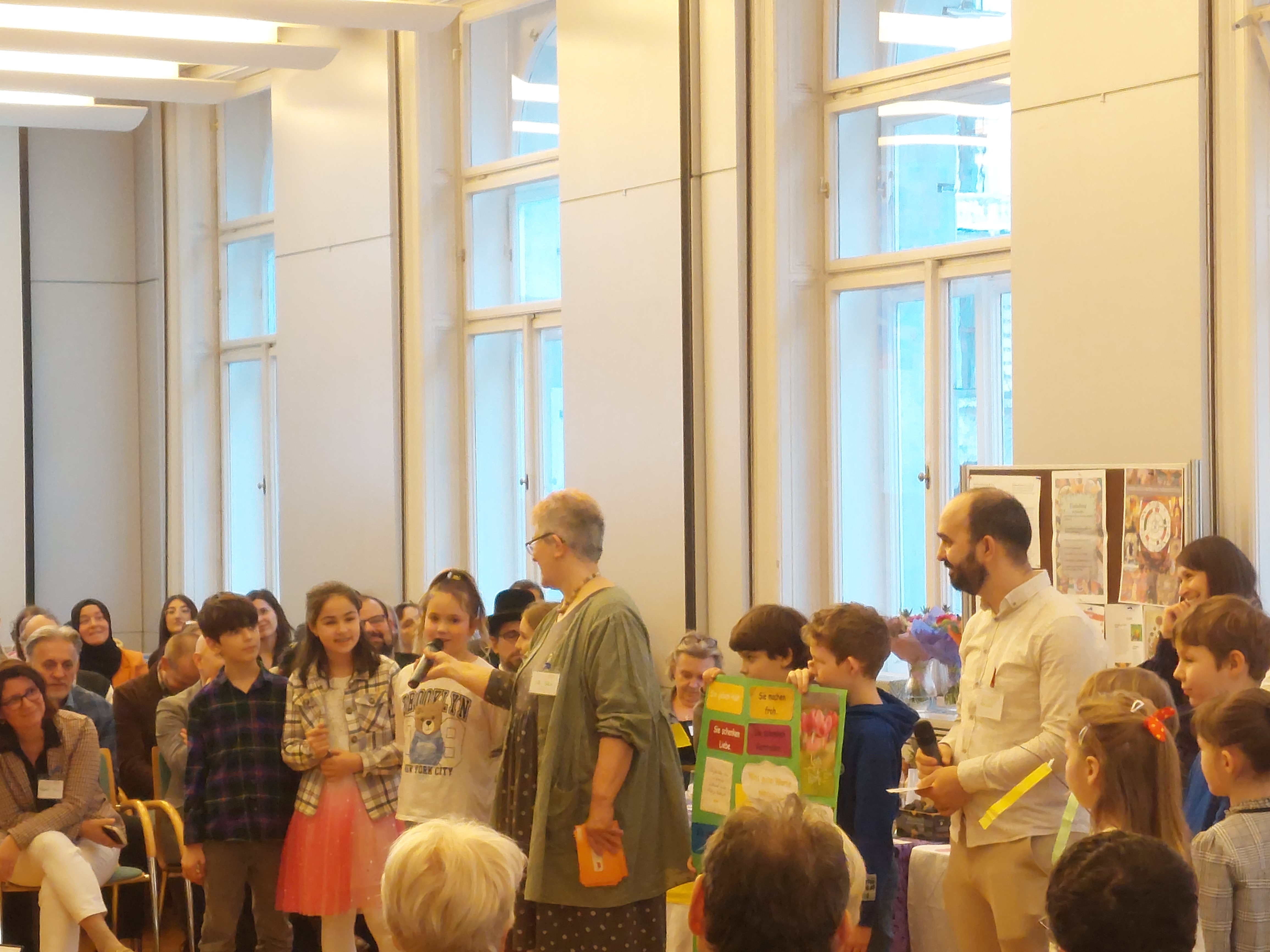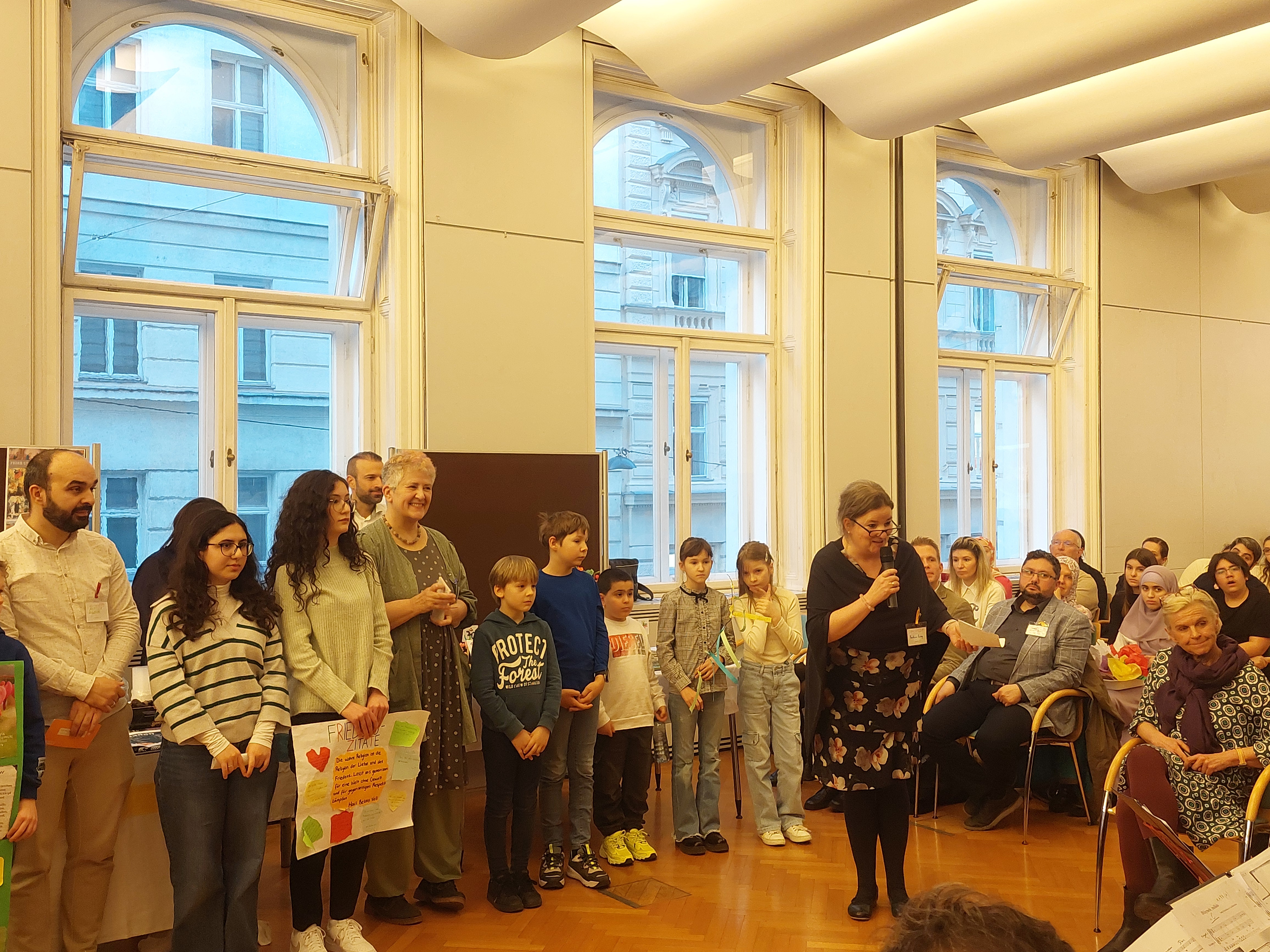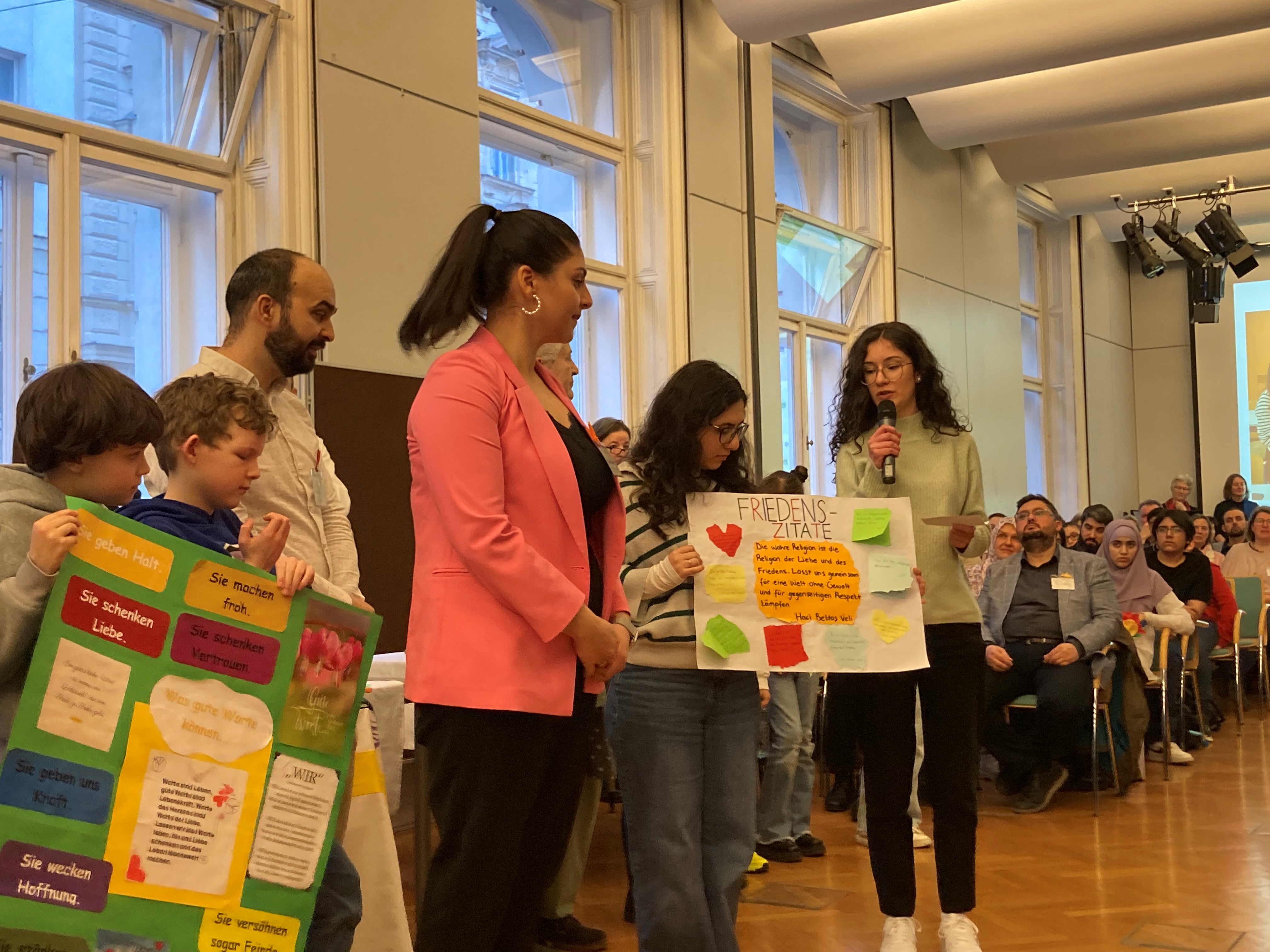 Die Schüler:innen präsentieren in Begleitung der beteiligten Pädagog:innen und Leiter:innen das „Weltreligionenprojekt“ sowie den „Tisch der guten Worte“ aus der Volksschule, das „Lapbook“ aus dem alevitischen Religionsunterricht der Handelsschule und das campusübergreifende „Friedensgebet der Religionen“. Das Mazltov-Orchester aus der Friesgasse umrahmte die gesamte Veranstaltung musikalisch und im Anschluss an die Darbietungen blieben die Gäste noch zur interkulturellen Begegnung zusammen.