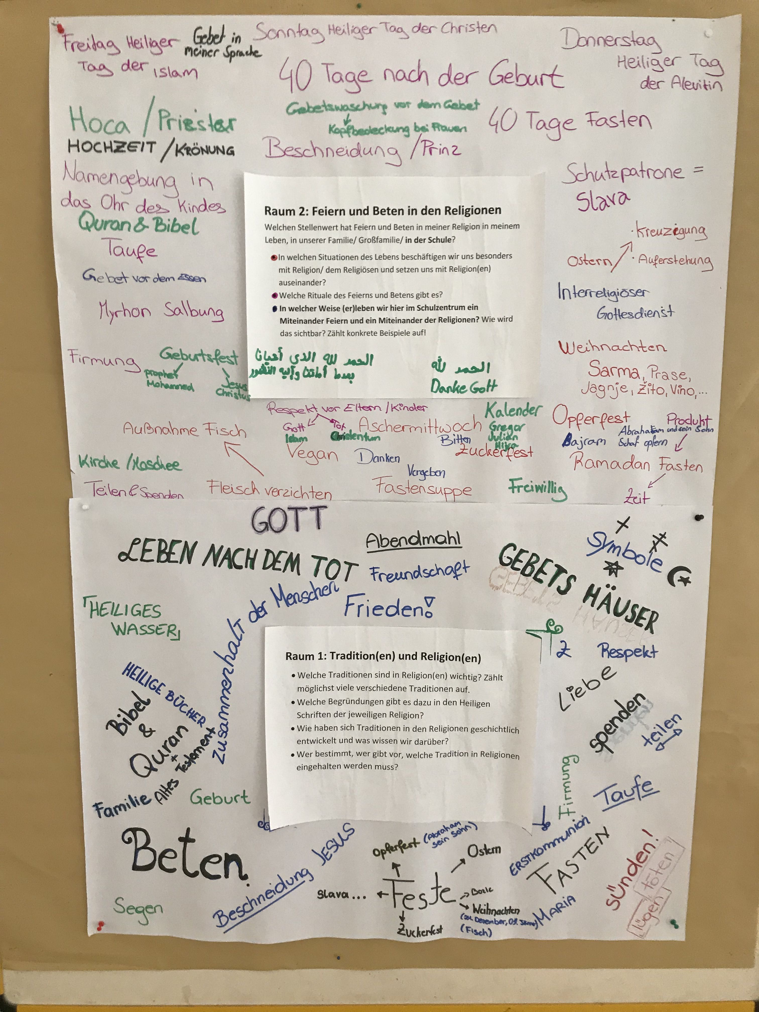 Höhepunkt der Woche in der HAS war der interreligiöse Projektnachmittag der 3. Klassen. Die Schüler*innen diskutierten mit den Religionslehrenden aller Konfessionen und Religionen zu den Themen: Religionen und Traditionen, Feiern und Beten, Stellung der Frauen in den Religionen und meditierten das in der Aula aufgehängte Fastentuch.