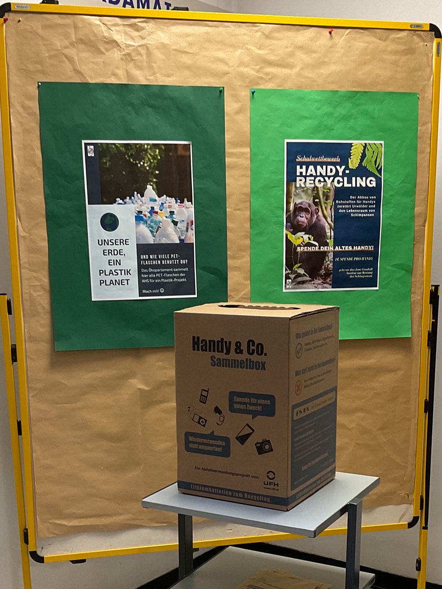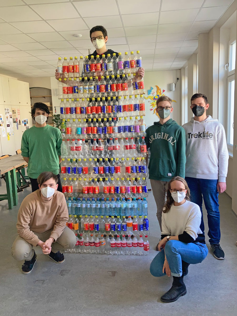 Auch das Ökoparlament hat engagiert mitgewirkt: Es wurden in der gesamten AHS alte Mobiltelefone für die Handy-Recycling-Aktion des Jane Goodall Instituts zum Schutz der Schimpansen gesammelt. Ein weiteres Anliegen des Ökoparlaments war die Reduktion des Verbrauchs von PET-Flaschen in unserer Schule. Aus diesem Grund wurden seit Beginn des 2. Semesters alle benutzten PET-Getränkeflaschen gesammelt, die am Ende des Schuljahres als Skulptur im Rahmen einer Ausstellung über Daten, Fakten und Auwirkungen des Kunststoffverbrauchs präsentiert werden. Insgesamt haben sich am Projekt ca. 130 Schüler*innen beteiligt. Dank dieses enormen Engagements darf sich unsere Schule über Experimentiermaterial für den Chemieunterricht im Wert von ca. 1000 Euro freuen. Vielen Dank an alle Schüler*innen und Lehrer*innen, die trotz dieses herausfordernden Schuljahres so engagiert mitgewirkt haben!