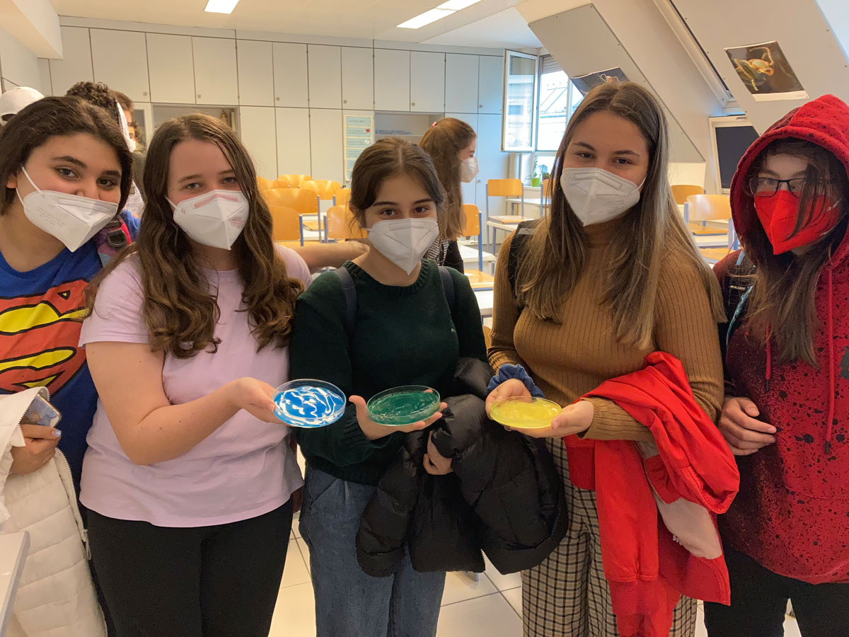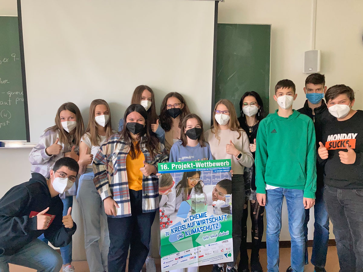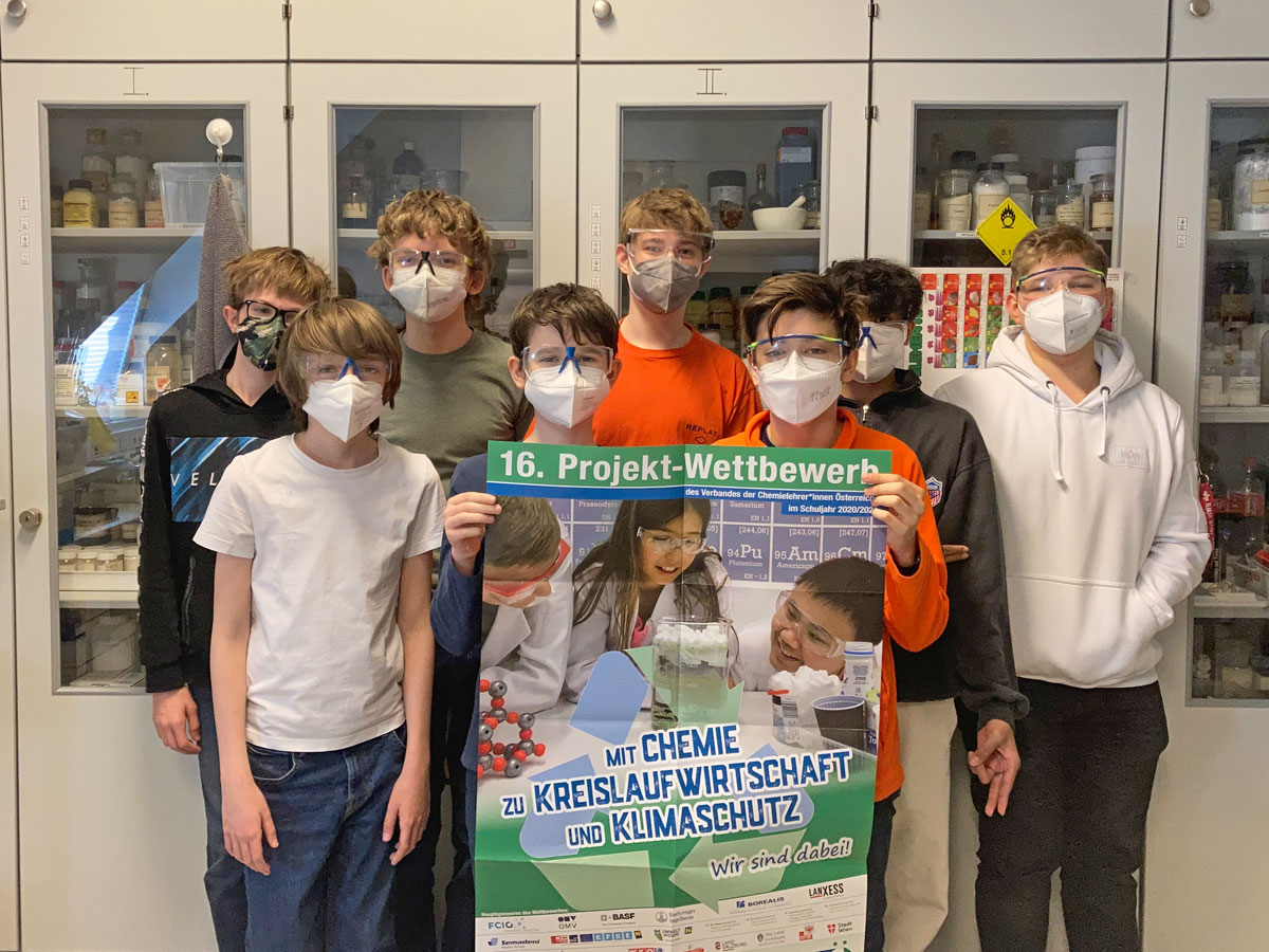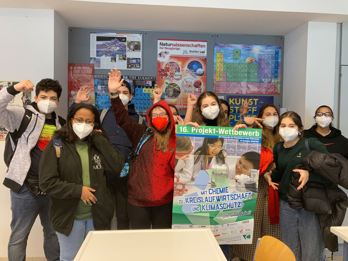 Die Schüler*innen der 4A und 4B haben am diesjährigen Projektwettbewerb des Verbands der Chemielehrer*innen zum Thema „Mit Chemie zu Kreislaufwirtschaft und Klimaschutz“ teilgenommen. Im Mittelpunkt standen die Schwerpunkte „Die stofflichen Ressourcen in Handys“ und „Kunststoffe in der Kreislaufwirtschaft“. Die Schüler*innen beschäftigen sich nicht nur theoretisch, sondern auch praktisch mit diesen Themen: Sie bestimmten experimentell die Eigenschaften unterschiedlicher Kunststoffarten, stellten Bioplastik her, reflektierten und dokumentierten den eigenen Kunststoffverbrauch, sammelten in der Natur zurückgebliebenen Kunststoffmüll oder befragten Passanten zum Thema „Mikroplastik“. Unterstützt wurde das Projekt von drei weiteren Klassen, die die genannten Schwerpunkte in unterschiedlichen Fächern thematisierten: