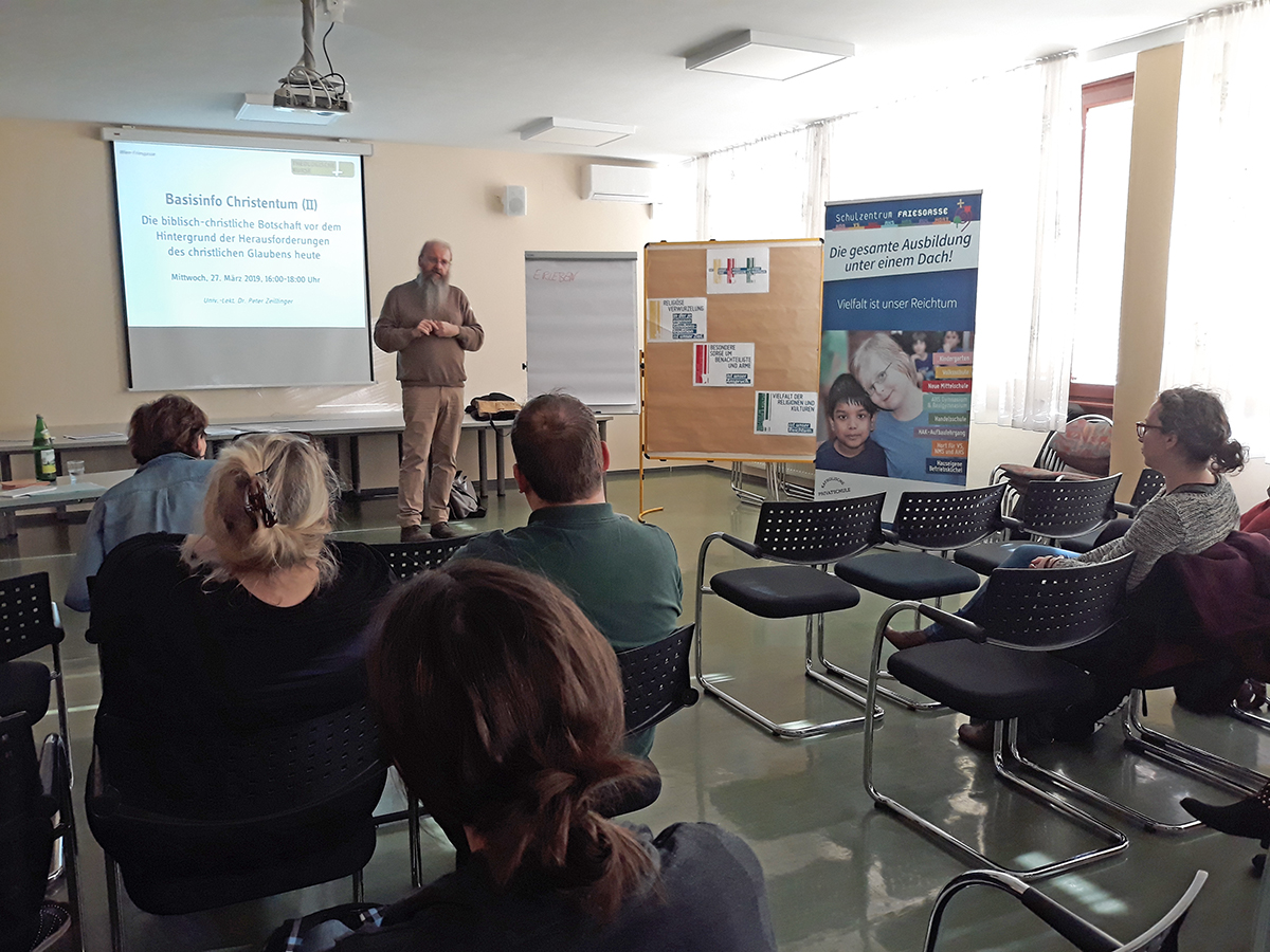 Zweimal schon in diesem Semester haben sich LehrerInnen und PädagogInnen des Schulzentrums Friesgasse zu einer Fortbildung zum Thema Basiswissen Christentum im Seminarraum zusammengefunden. Dieses Angebot von Vorträgen durch den renommierten Theologen Dr. Peter Zeillinger (von den theologischen Kursen der Bischofskonferenz) kam von Seiten des Schulerhalters.